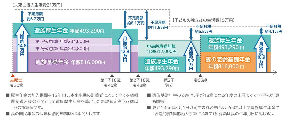 このとき、第1子が18歳になるまで受け取れる公的保障(遺族年金)は月々14.8万円となり、毎月の不足額はおよそ6.2万円です。